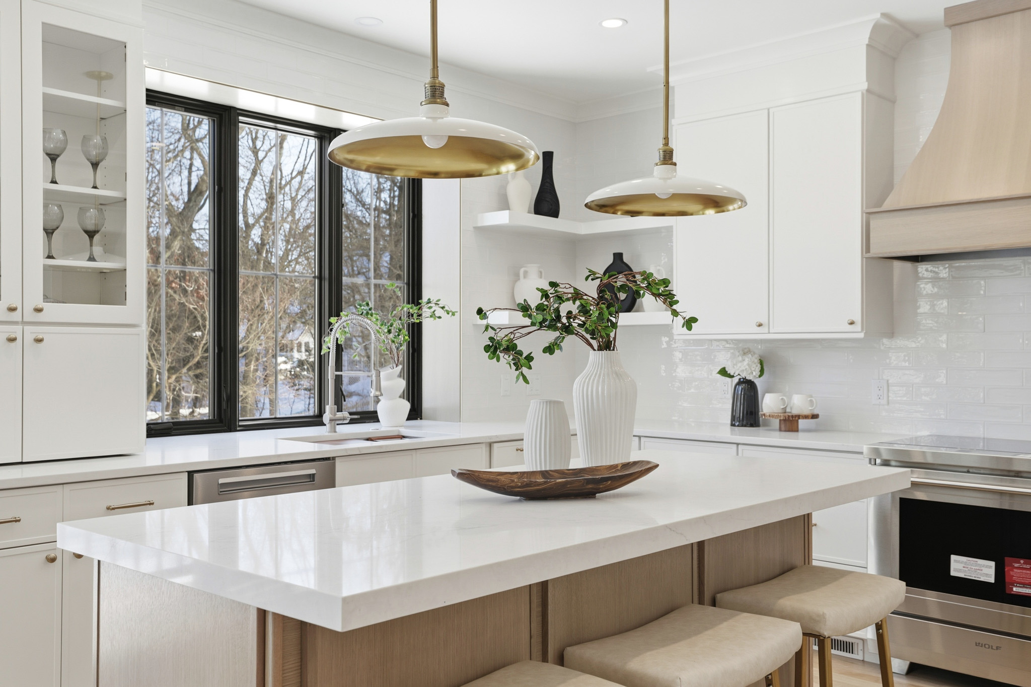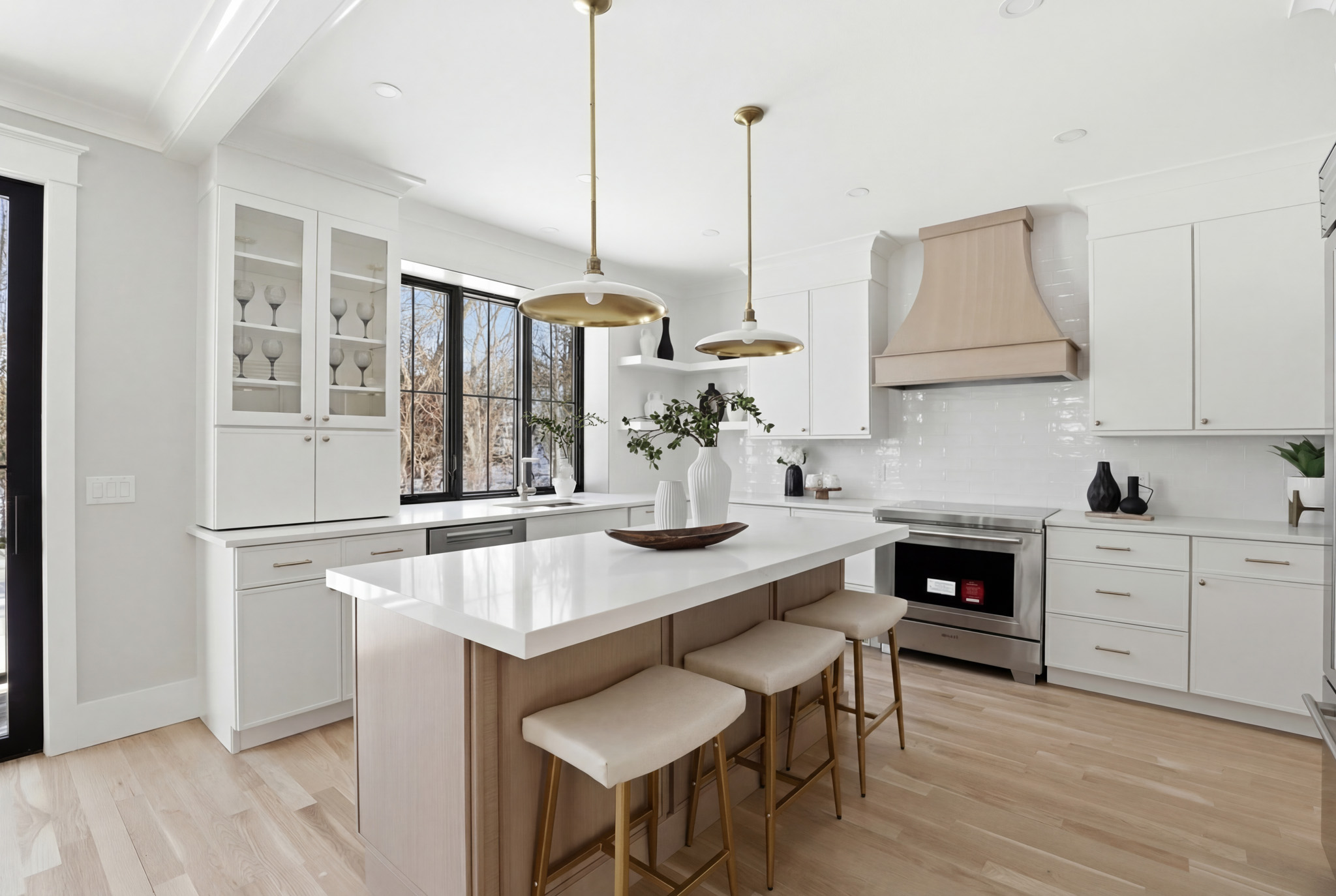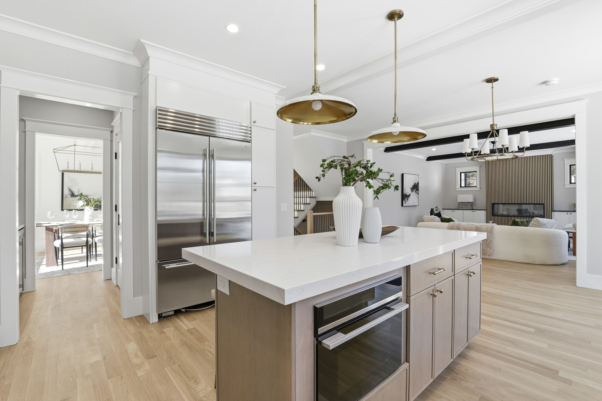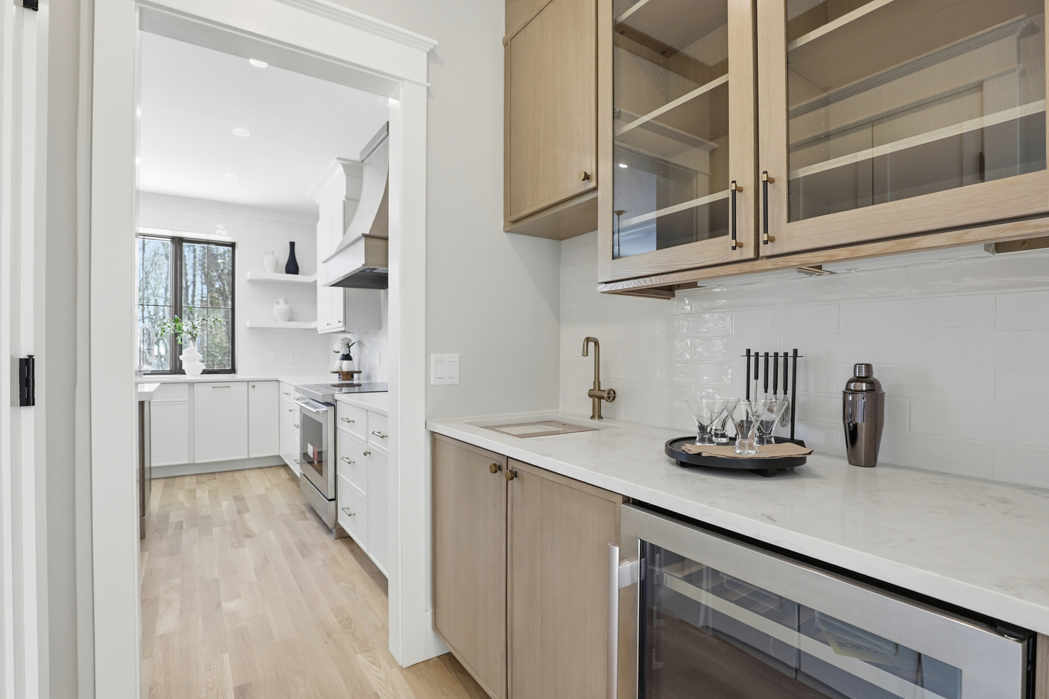 • The main level features high ceilings and a custom gourmet kitchen with high-end appliances, quartz countertops, a large island, and butler’s pantry,